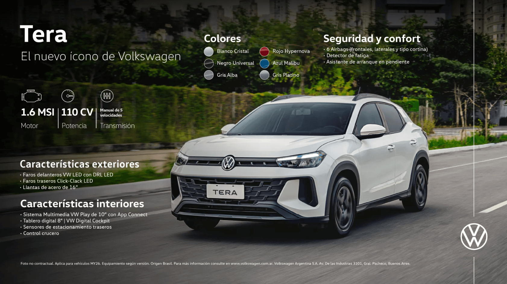 Dale tu propio estilo a tu Volkswagen Tera. Elegí entre seis colores que lo hacen único: los clásicos Blanco Cristal, Negro Universal y Gris Platino, o atrevete a destacar con los nuevos Azul Malibu, Gris Alba y Rojo Hypernova.