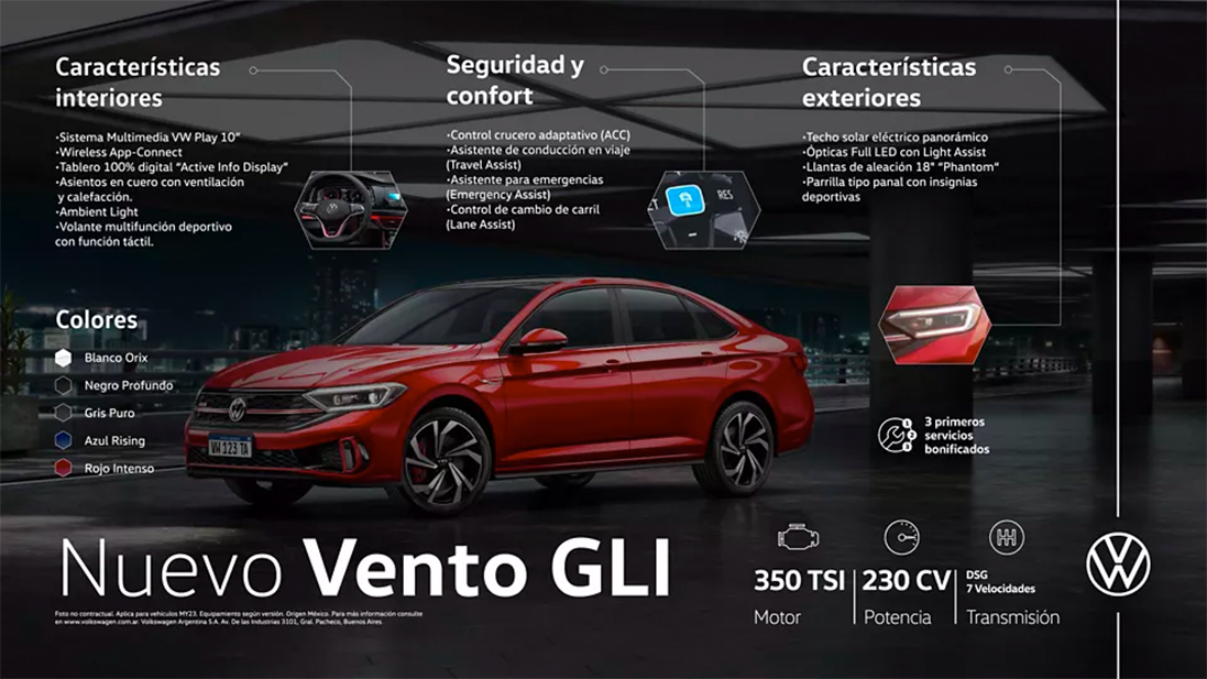 El Nuevo Vento GLI incorpora un selector de perfiles de conducción que modifica las configuraciones del vehículo adaptándolas a tus gustos y requisitos. Cada uno es una experiencia de manejo única para que sientas nuevas sensaciones en cada viaje.